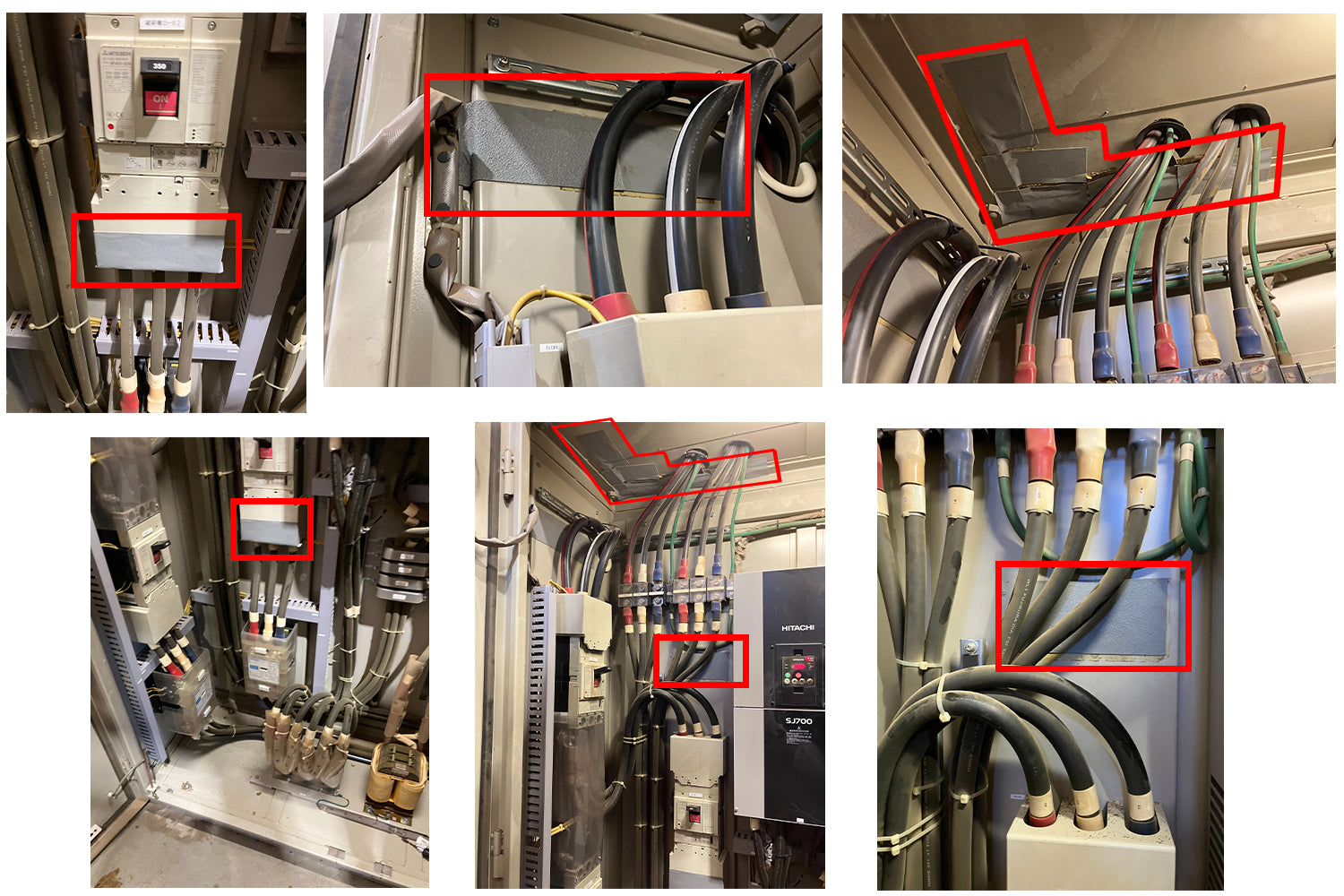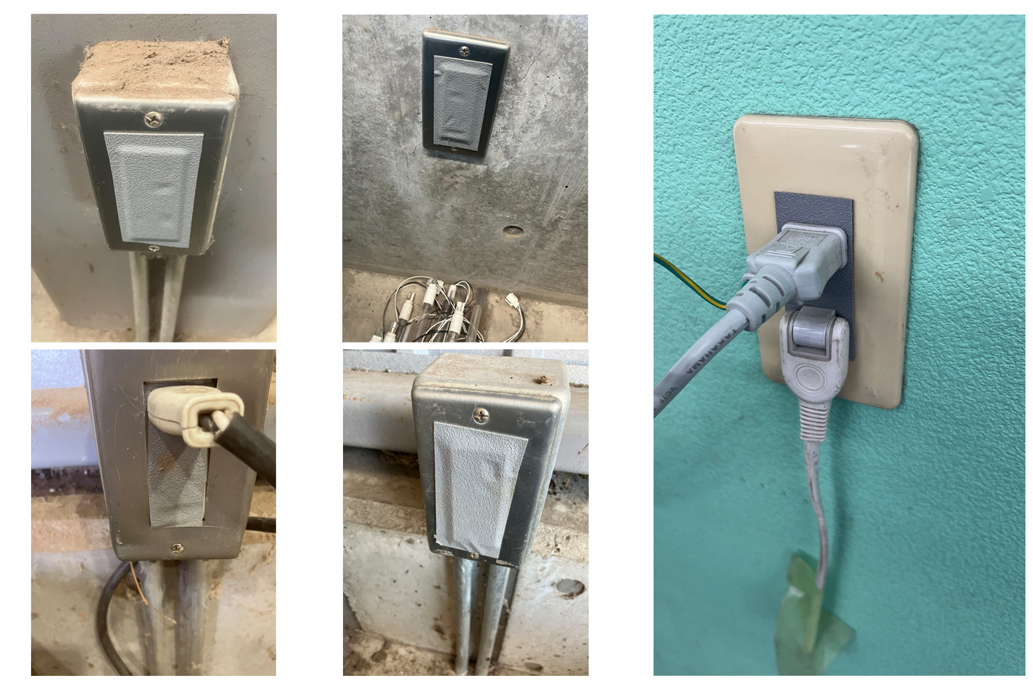 埃が溜まりやすい加工場のコンセントに、シートタイプの自己消火ステッカーを設置いたしました。消火効果を高めるため、大きめにカットしたシートでコンセントの差し込み口全体を広く覆うようにしております。また、ピンポイントで簡単に設置できる3cm×3cmサイズにあらかじめカットされたタイプもご用意しております。