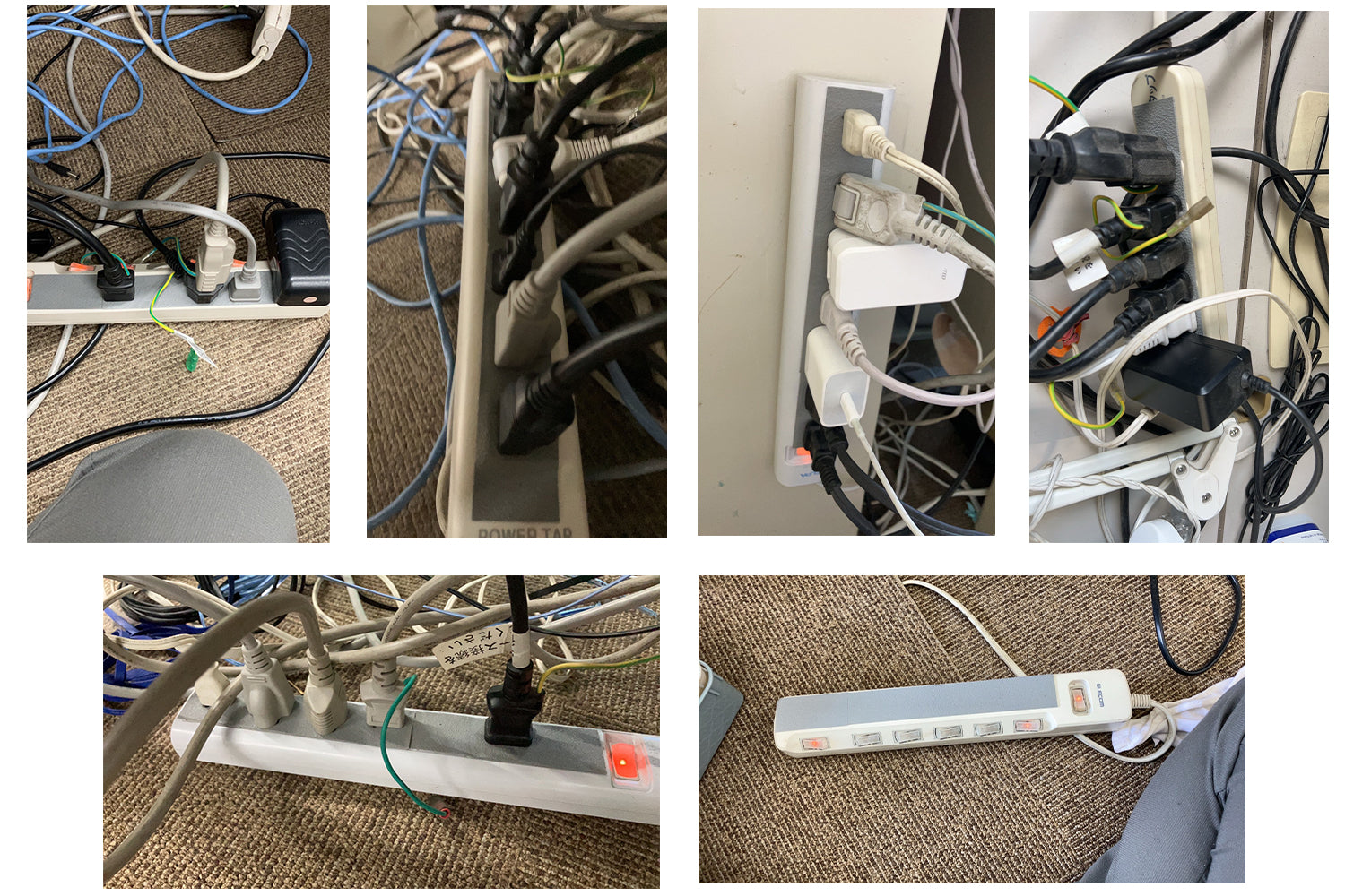 電源タップにシートタイプの自己消火ステッカーを設置いたしました。電源タップは、机の下やパソコンの裏側などに設置されることが多く、掃除が行き届きにくい場所です。また、複数のコンセントが接続されることで、埃が溜まりやすくなっております。